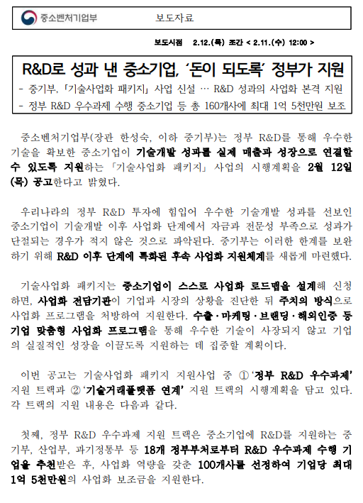 (중기부) R&D로 성과 낸 중소기업, ‘돈이 되도록’ 정부가 지원