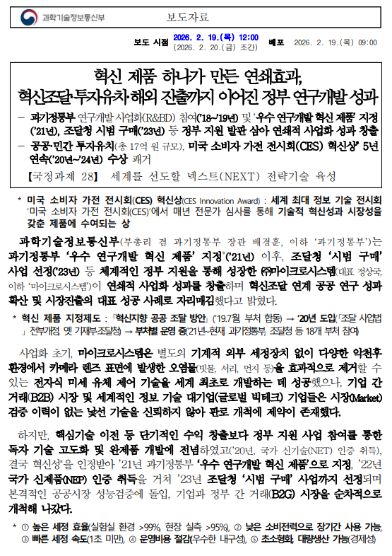 - 260220 조간 보도 혁신제품 하나가 만든 연쇄효과, 혁신조달·투자유치·해외진출까지 이어진 정부 RD 성과수정.hwpx (5.8M) 0회 다운로드 | DATE : 2026-02-20 09:46:36